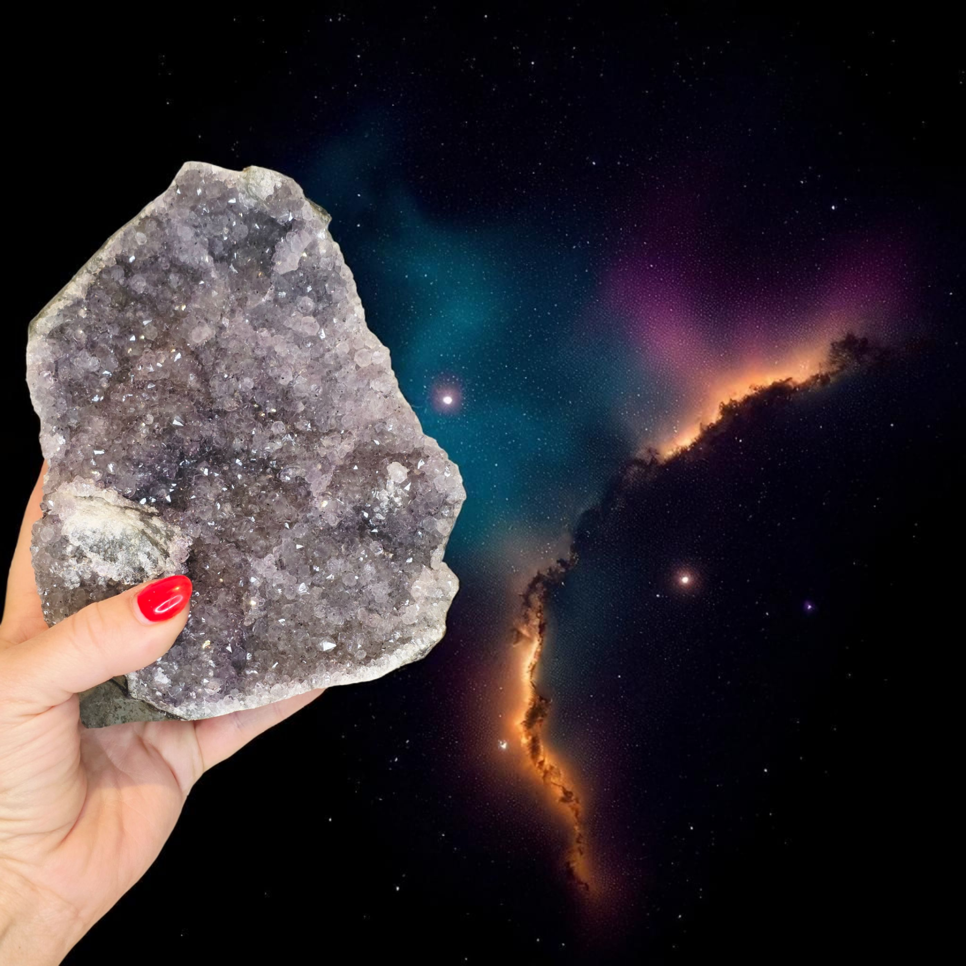 • De unieke ‘sterrenhemel’-structuur van Galaxy Amethist wordt geassocieerd met kosmische inspiratie en creativiteit.