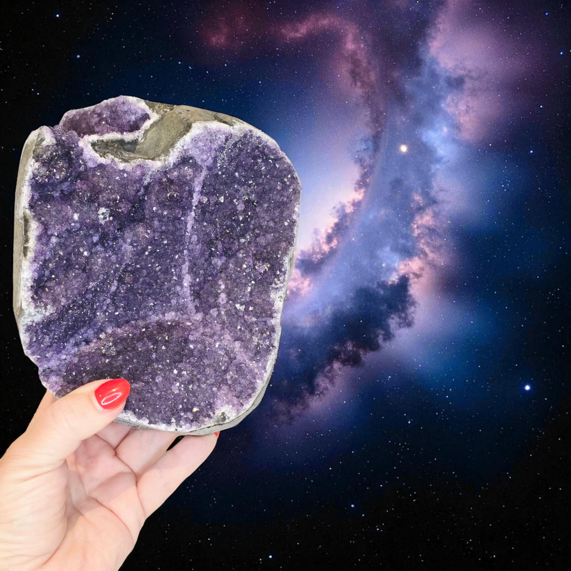 • De unieke ‘sterrenhemel’-structuur van Galaxy Amethist wordt geassocieerd met kosmische inspiratie en creativiteit.